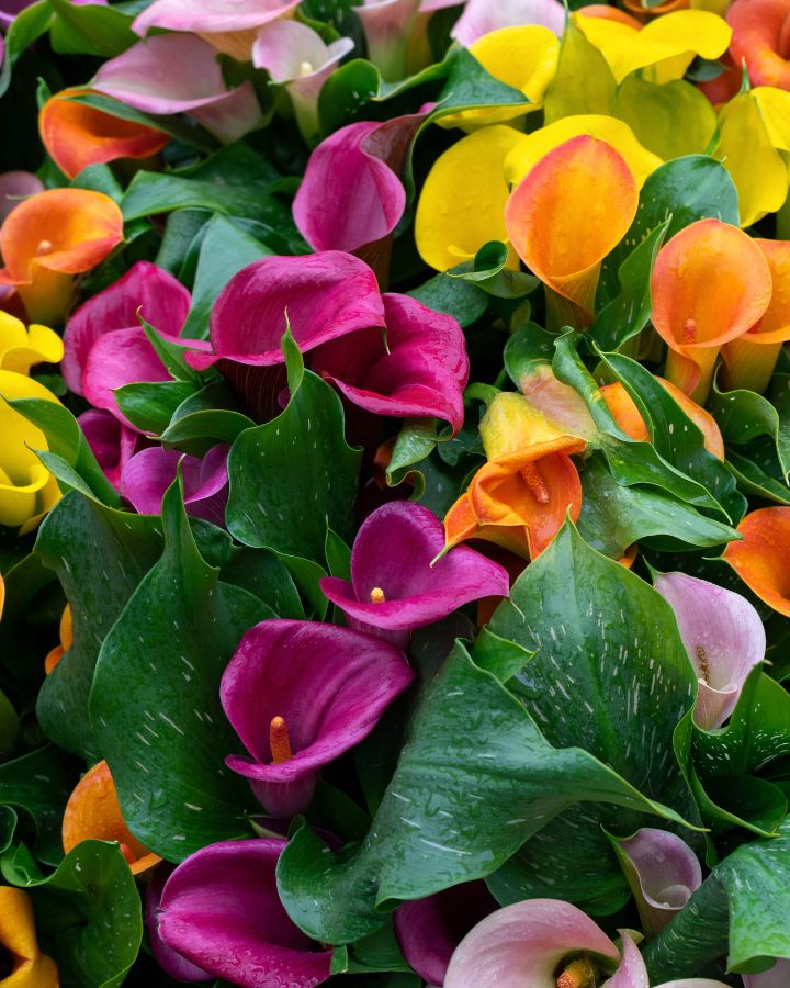 Вони виростають до 50 см - 60 см. Кореневища (цибулина) у калли – плосковате округле, нагадує бульби бегоній або глоксиній. Восени, коли закінчується цвітіння, у кал настає період відпочинку. Їх листя втрачають декоративність, і рослина йде на повний зимовий спокій. Зверніть увагу, калли можуть бути вирощені і як кімнатна рослина, або в саду у відкритому ґрунті. Вони довго і рясно квітнуть. І кожен з них зберігає свою індивідуальну декоративність протягом місяця. Ці квіти настільки гарні, що це, безумовно, послужить стимулом, купити калли. Наш магазин представляє вам прекрасну колекцію бульбових гібридних кал самих різних забарвлень, від ніжно пастельних тонів, до чорних і біколорів: