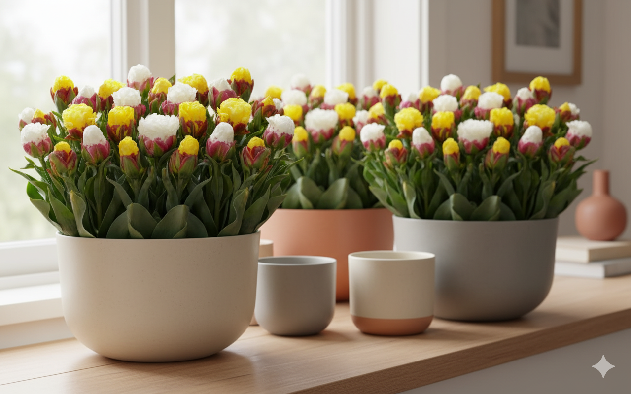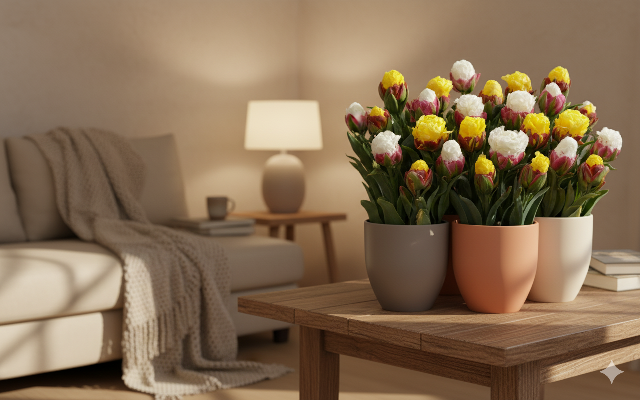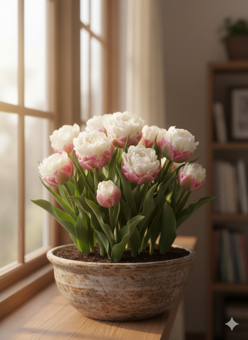Для успішного вирощування тюльпанів «Ice Cream» у кімнатних умовах оберіть світле місце з м’яким, розсіяним освітленням.